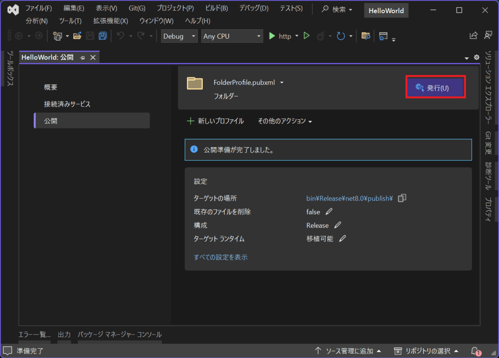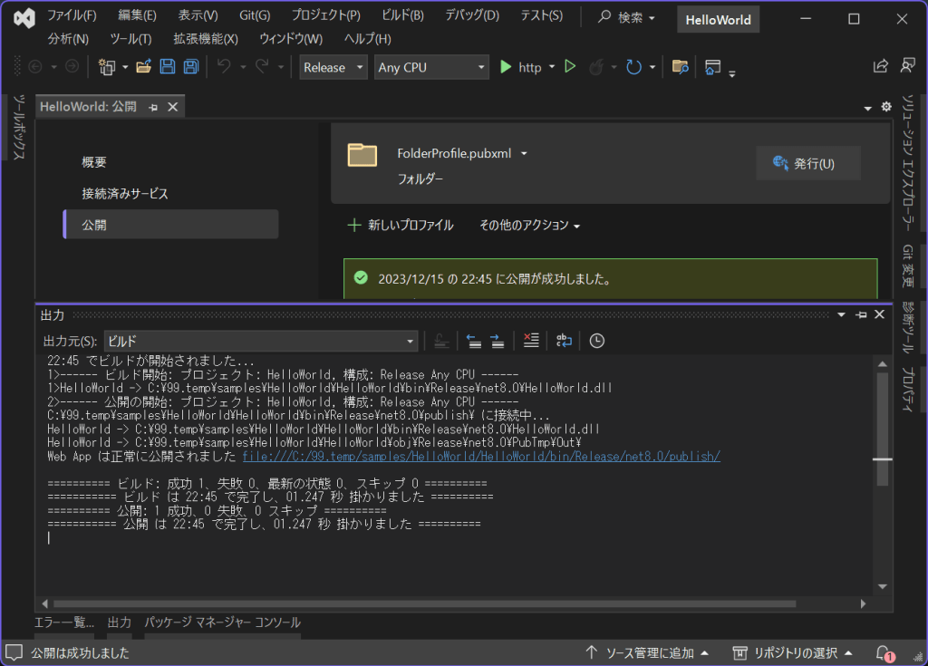 次に作成したアプリケーションを実行環境に配置する準備をします。Visual Studioの「ビルド」>「HelloWorldの発行」をクリックします。