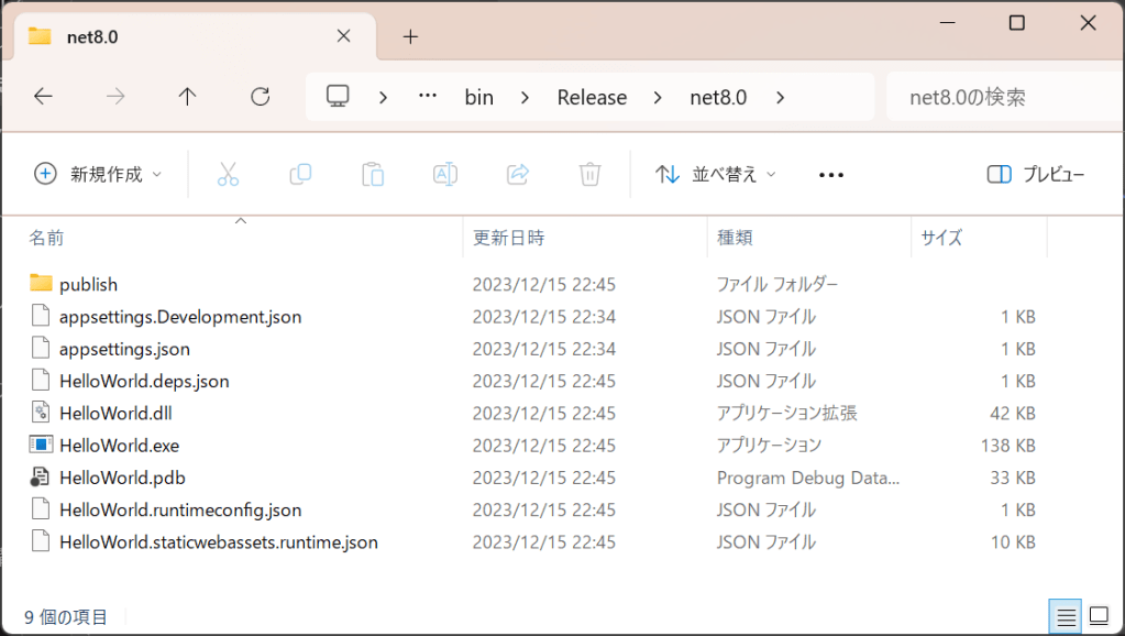以下のように出力されます。アプリ名.exeとアプリ名.dllはセットでの出力のようです。