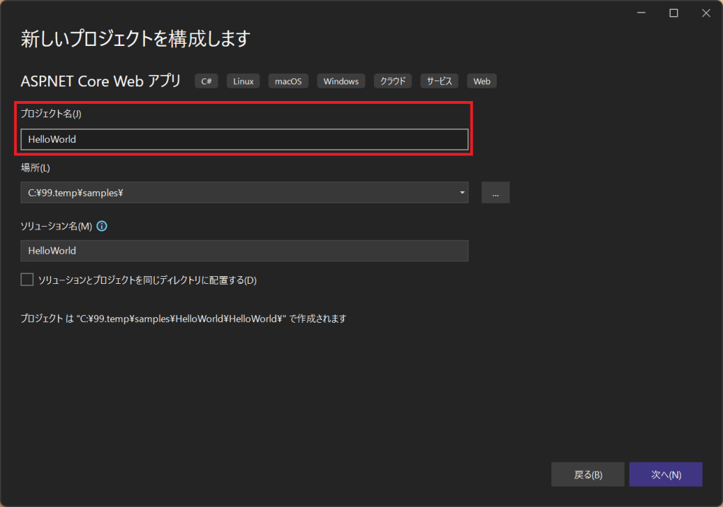 「ASP.NET Core Webアプリ」テンプレートを選択します。