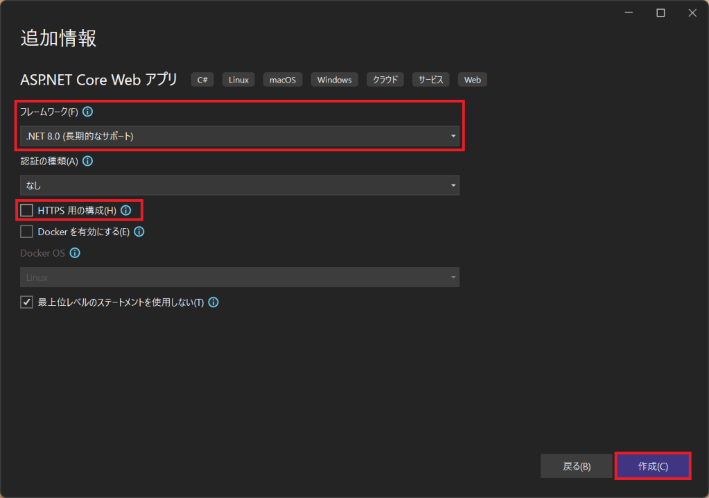 フレームワークに「.NET 8.0」を選択し、今回は「HTTPS用の構成」を外します。