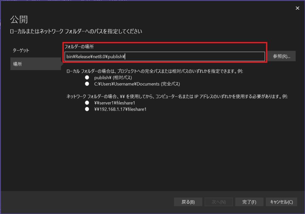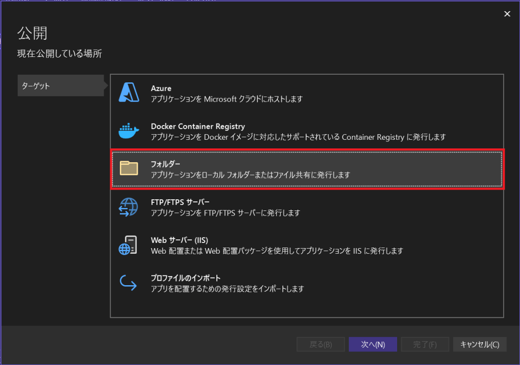 公開場所として「フォルダー」を選択します。