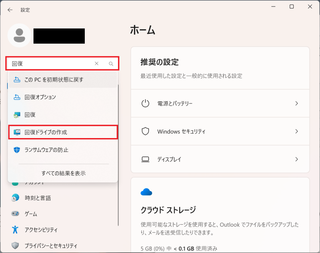 最初に「設定」画面から検索バーに「回復」を入力して「回復ドライブの作成」メニューを選択します。
