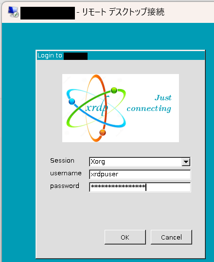 「Session」は「Xorg」のままで、「username」、「password」にそれぞれ先ほど作成したユーザの情報を入力して進みます。