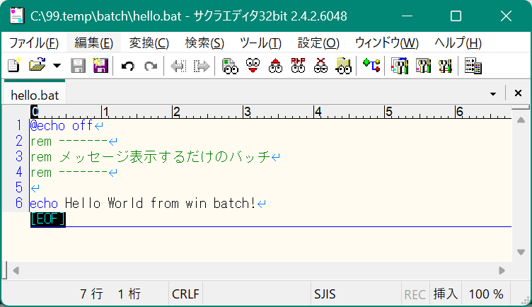 お好きなテキストエディタを開いてバッチファイルを作成します。ここでは「hello.bat」という名称で下記のように保存しました。
