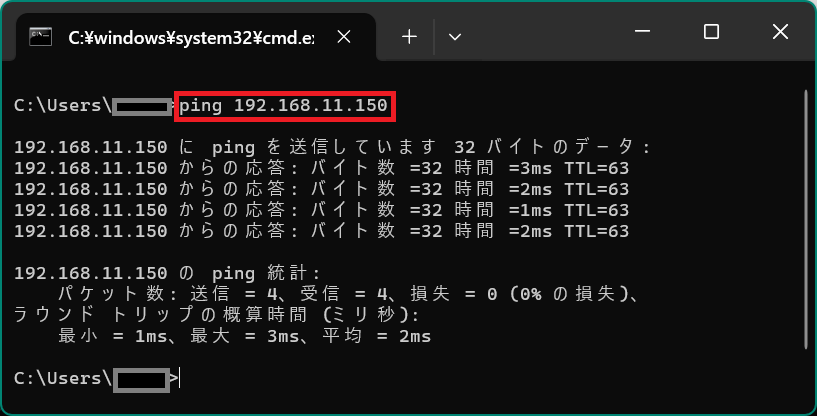 Windows環境から機器の稼働確認をするため、コマンドプロンプトよりPingを実行しようとしました。