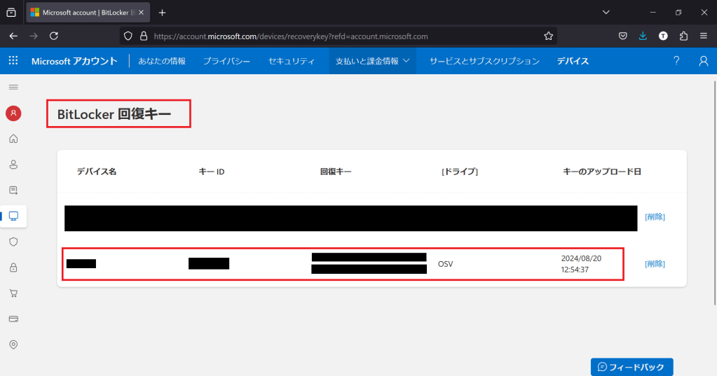 ■Microsoftアカウントへ保存したBitLocker回復キーの確認
