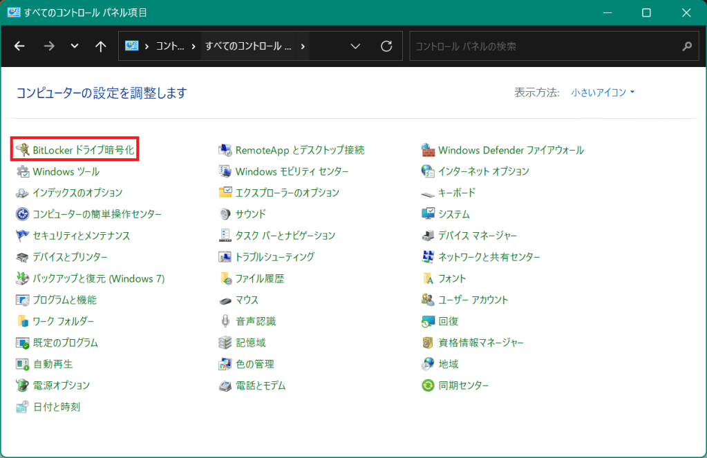 コントロールパネルから「BitLocker ドライブ暗号化」を選択します。