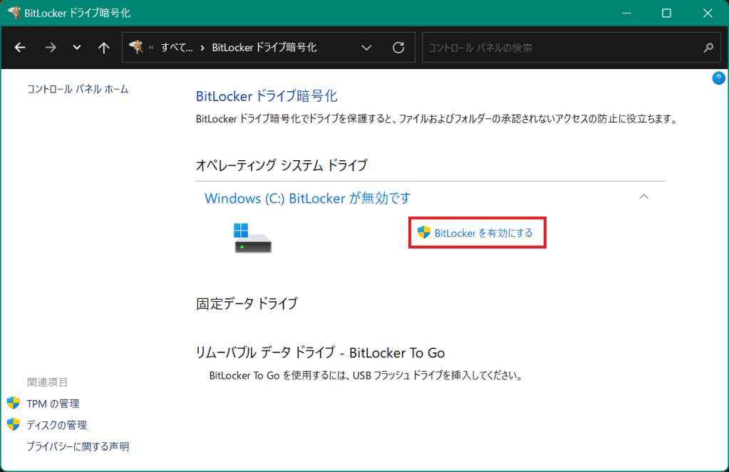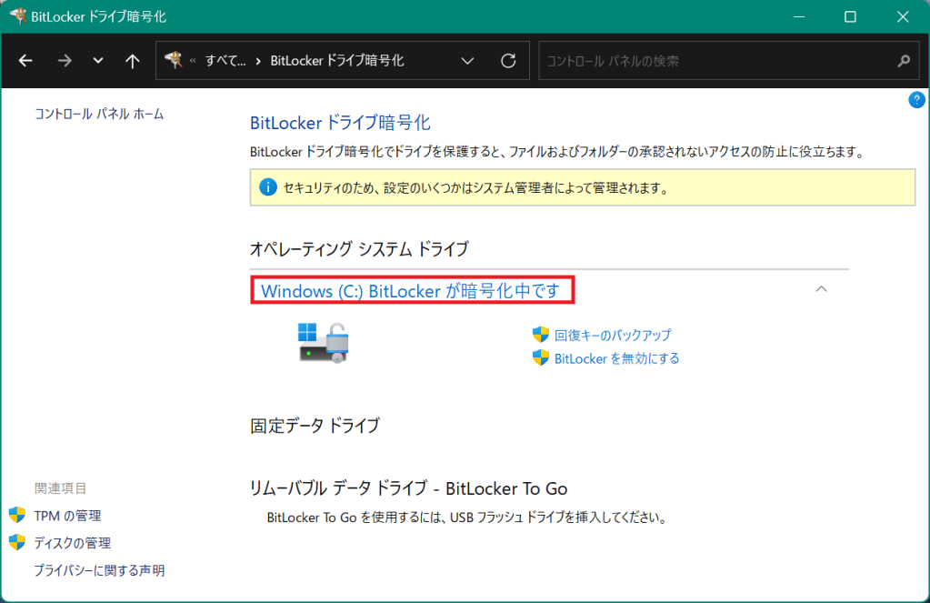 Windows11Pro環境でBitLockerによるディスクの暗号化を実施した際の手順を記録します。
