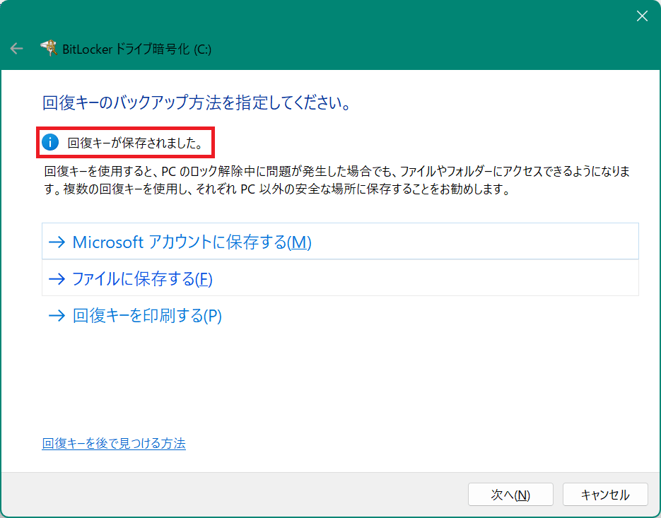 「回復キー」と呼ばれるロック解除時に問題が発生したときに利用するキーを保存する方法を選択します。いざ必要となる時に備えて、この回復キーはきちんと管理(バックアップ)しておきましょう。回復キーは暗号化する度に生成されるものなので、一度暗号化を無効化して再度有効化する際は前回作成したキーは使えないので注意しましょう。ここではPCのログインで用いているMicrosoftアカウントでまとめて管理したかったので、「Microsoftアカウントに保存する」を選択しました。(ちなみにファイルに保存するを選択する場合、暗号化しようとしているPCには保存できないので注意が必要です)