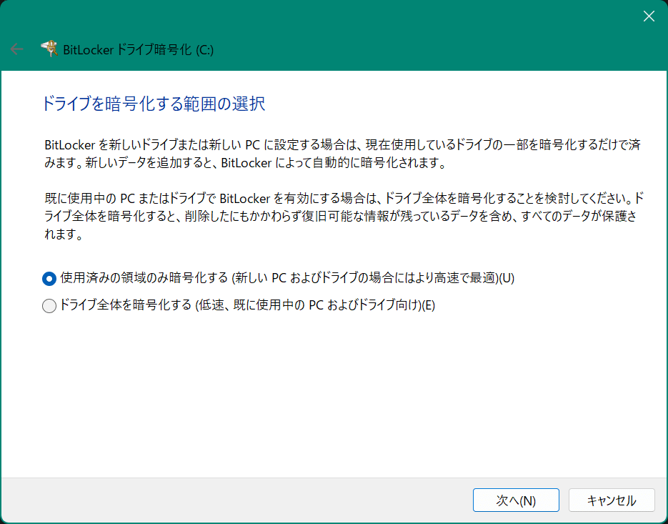 次に暗号化する範囲を選択します。新規PCでこれから利用する場合は、「使用済の領域のみ暗号化する」でよいです。
