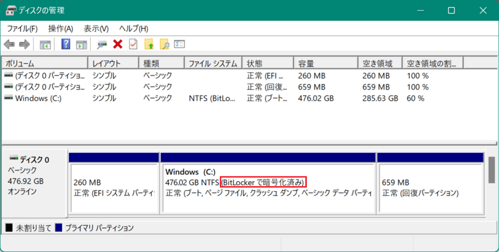 ディスクの管理メニューよりディスクのプロパティを確認すると「BitLockerで暗号化済」と表示されます。