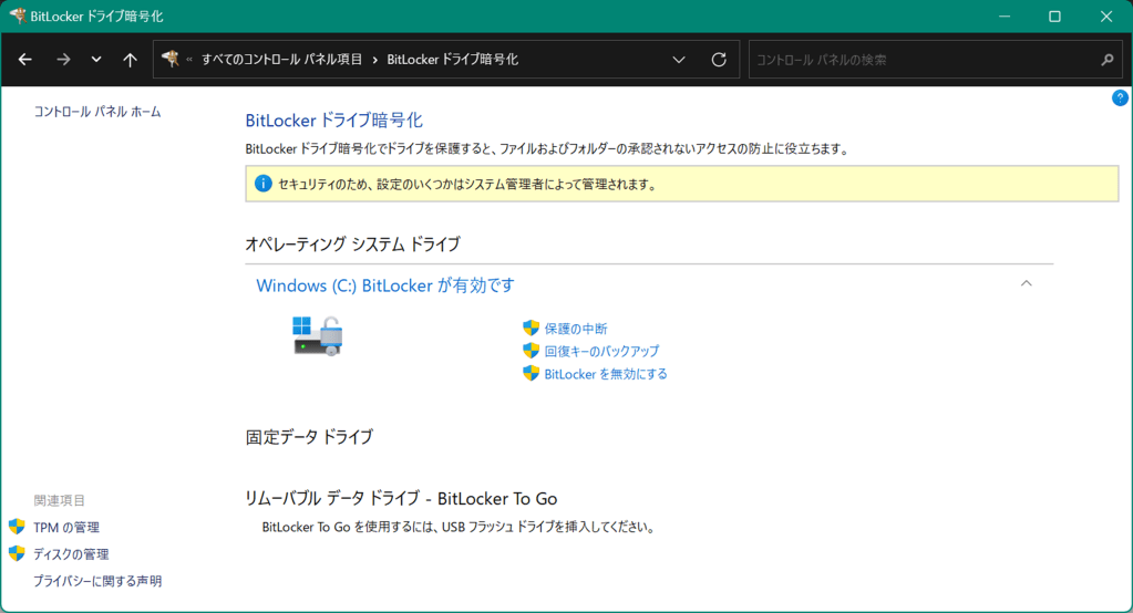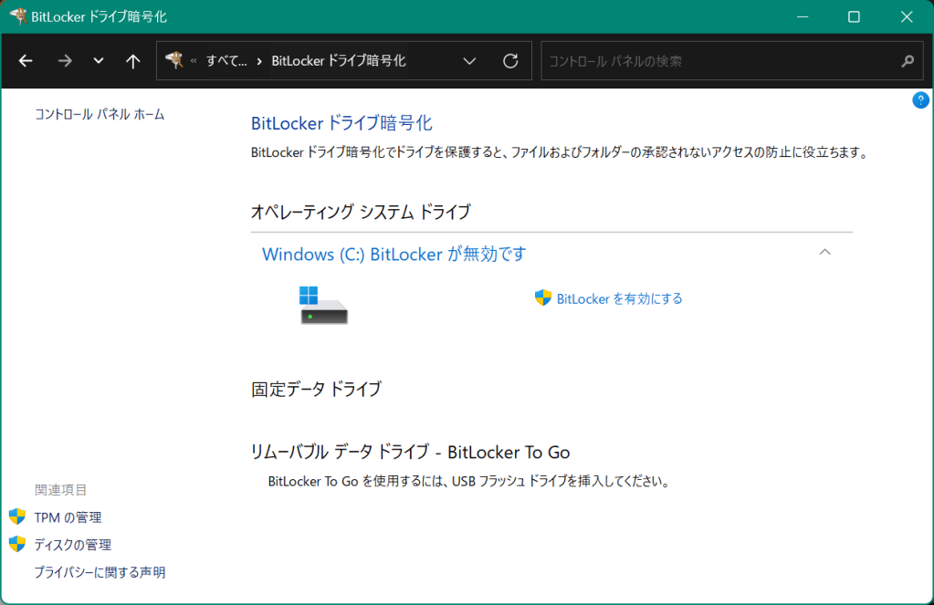 解除されると、「BitLockerが無効です」と表示されるようになりました。