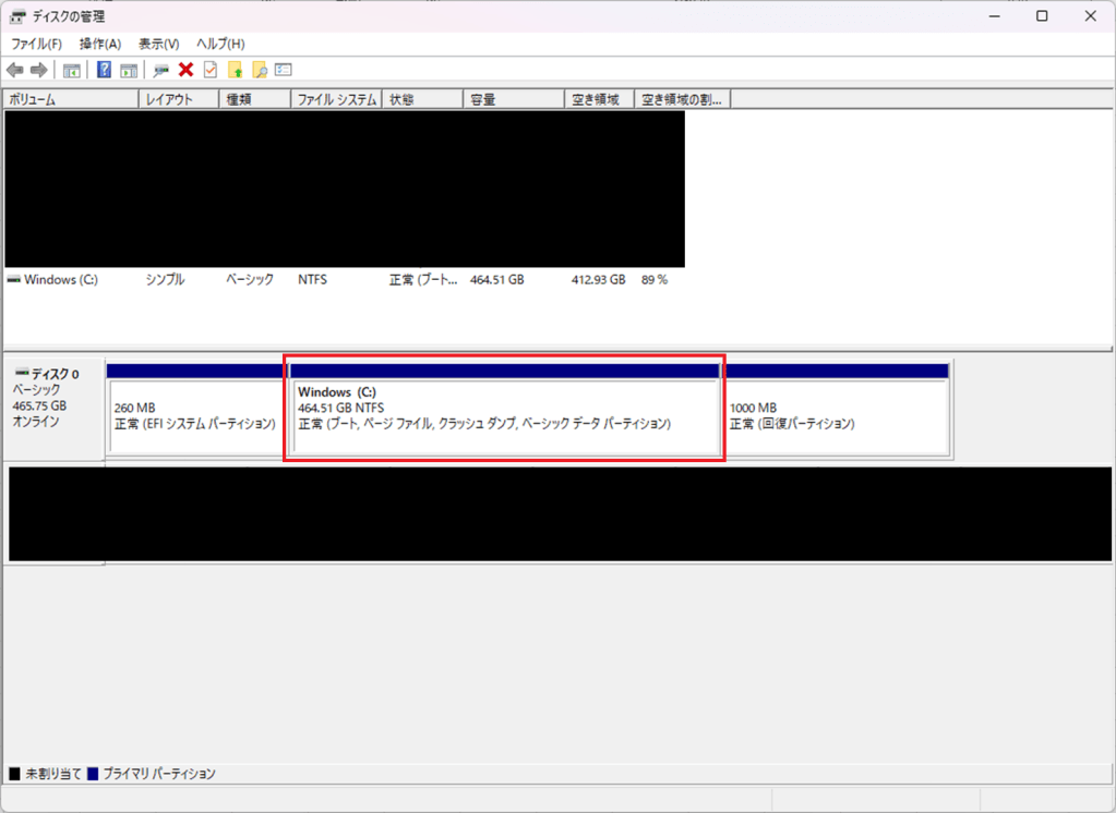 ここでは元のサイズが465GBくらいのディスクを縮小したいと思います。以下は「ディスクの管理」ツールで見たところです。