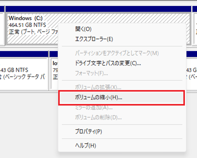 ディスクの管理ツール上から該当のディスク上で右クリックして「ボリュームの縮小」をクリックします。