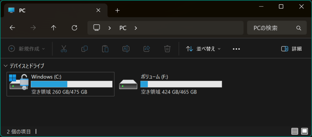 OSで認識しているドライブが表示されるので「メディアの種類」の欄で表示される値を確認します。「ハードディスクドライブ」(HDD)や「ソリッドステートドライブ」(SSD)と表示されます。(私の環境ではともにSSDです)
