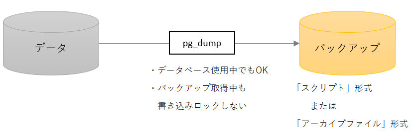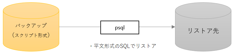 | スクリプトファイル形式 | ・「取得時点の状態を再現するためのSQLコマンドを生成する」ことでバックアップを実現します。 ・リストアには「psql」コマンドで復旧します。 |