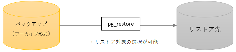 | アーカイブファイル形式 | ・リストアには「pg_restore」を用います。 ・リストア時にリストア対象の選択ができたり、並べ替えを実施できたりします。 |
