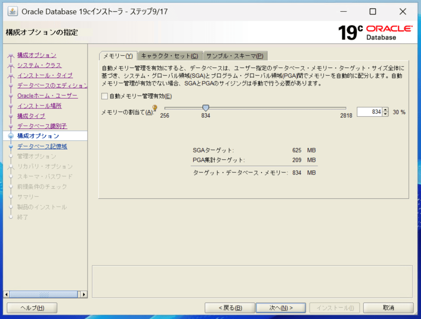 「構成オプションの指定」でメモリの割り当てやキャラクタセットを指定します。