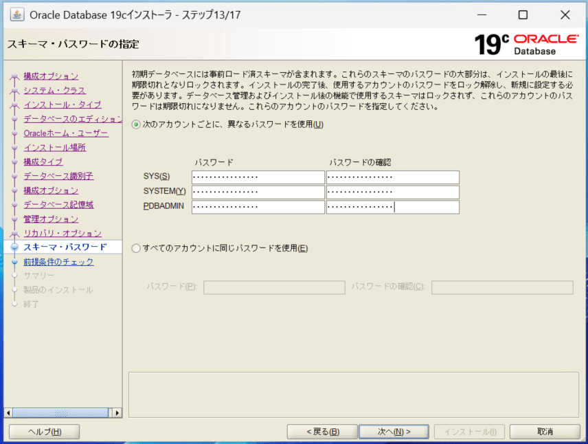 Oracleセットアップ時に作成される、SYS、SYSTEM、PDBADMINのパスワードをそれぞれ設定します。各アカウントの説明は別記事でまとめたいと思います。