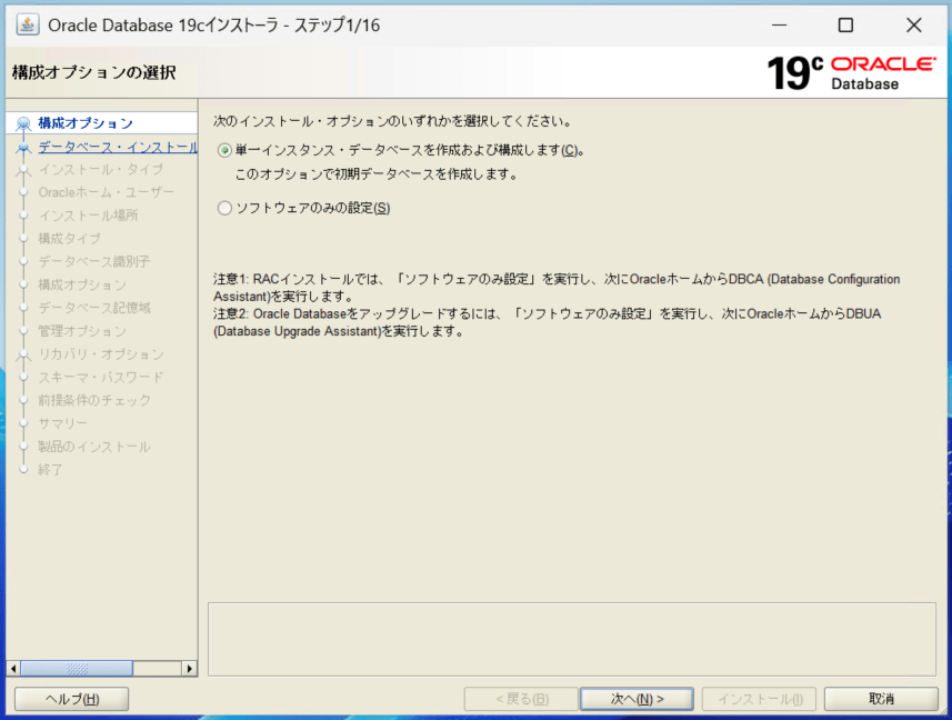 「構成オプションの選択」ではデータベースの作成を行いたいので「単一インスタンス・データベースを作成および構成します」を選択して「次へ」をクリックします。
