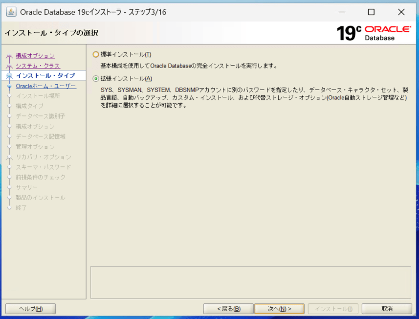 「インストール・タイプの選択」では細かい設定をしたいので「拡張インストール」を選択します。