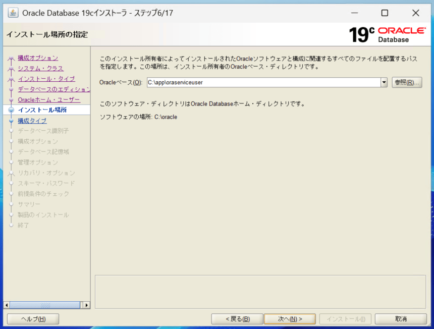 「インストール場所の指定」ではOracle関連のファイルの保存先を指定します。Oracleベースはインストールされるホスト上にインストール時に作成され、デフォルトでは「C:\app\Oracleホームユーザ名」となり、既存のOracleインストールがある環境では既設のOracleベースが選択できるようです。