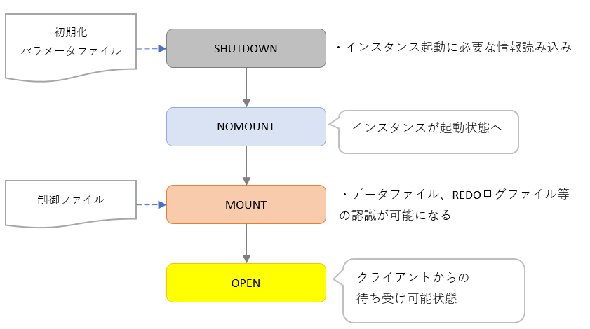- OPEN・・・データファイルのチェック等を行い起動完了し、クライアントからの通常処理を受け付けする状態