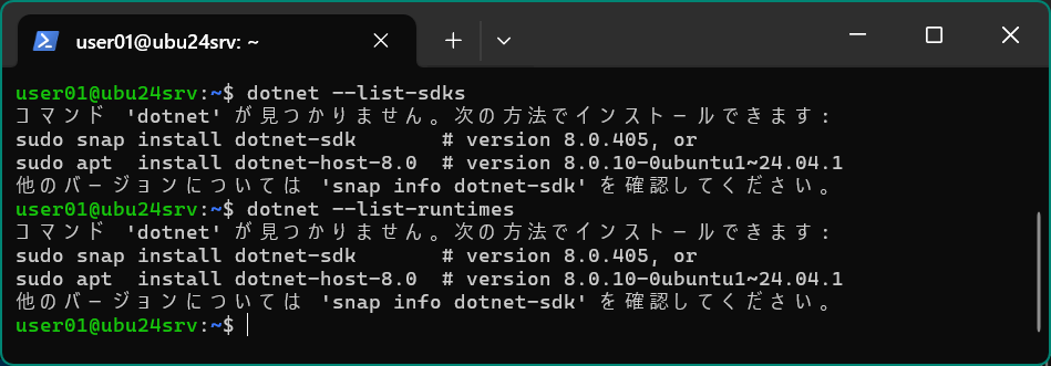 .NETがインストールされていないことを確認しておきます。いずれのコマンドも.NETがインストールされていないと以下のようなメッセージが表示され見つかりません。