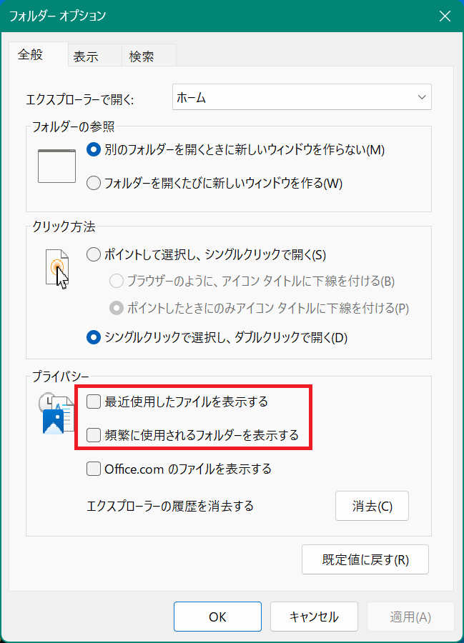 Windowsのエクスプローラで左側の「クイックアクセス」と呼ばれる部分によく使うフォルダへのショートカットが設定できます。設定によっては自動で表示されるので不都合がある場合があるため、設定の変更手順を整理します。
