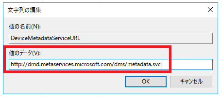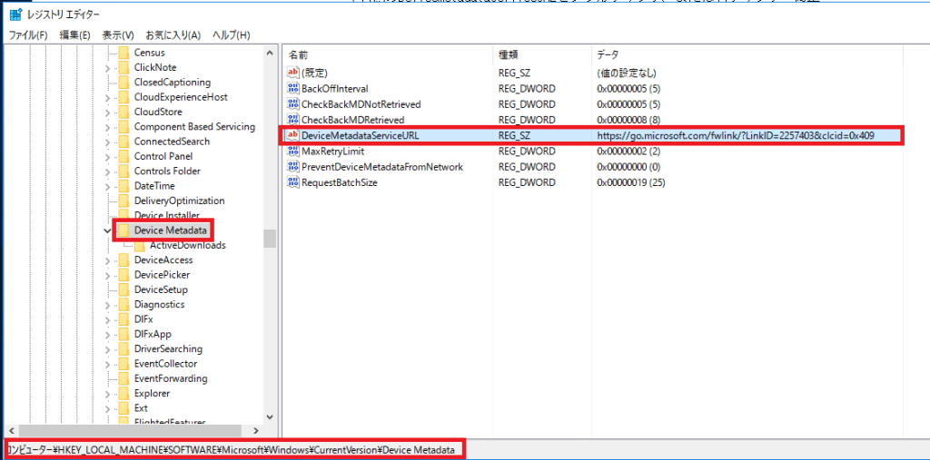 レジストリエディタを開いて「HKEY_LOCAL_MACHINE」>「SOFTWARE」>「Microsoft」>「Windows」>「CurrentVersion」>「Device Metadata」の中にある「DeviceMetadataServiceURL」の値を確認します。