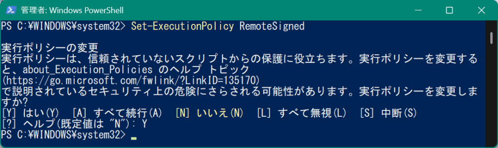 実行ポリシーを変更する際は以下のように確認があるので「Y」や「A」を選択して変更を進めます。