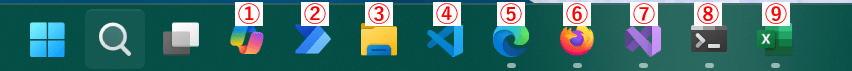 起動中のアプリ含めタスクバー上に以下のように表示されているとします。この時にVisual Studio Code(④)を起動したい場合は「Windowキー」+「4」と押せばOKです。対象のアプリが画面で現在のウィンドウであれば最小化しますし、最小化されていた場合は前面に表示される、といった具合です。