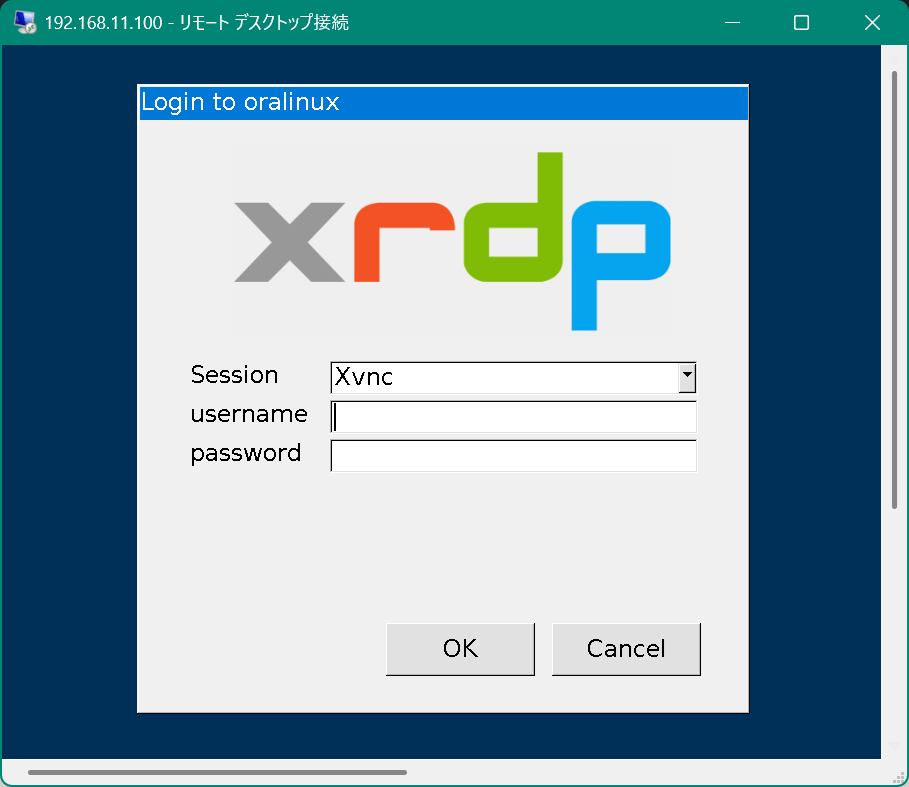 ログイン画面がxrdpのウィンドウとなっています。ユーザ名、パスワードを入力します。