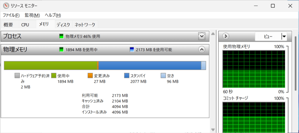 | 利用可能 | スタンバイ(キャッシュや非アクティブなデータ)と空き(未割当)のメモリ領域です |