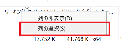 こちらもタスクマネージャより確認できます。「詳細」タブを表示してプロセスの一覧が表示された状態で、列の部分を右クリックして「列の選択」を行い、追加表示項目を選択します。