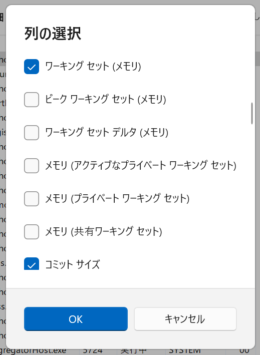 「ワーキングセット(メモリ)」と「コミットサイズ」を選択します。「ワーキングセット(メモリ)」は物理メモリの使用サイズを、「コミットサイズ」は仮想メモリの割当サイズを示します。