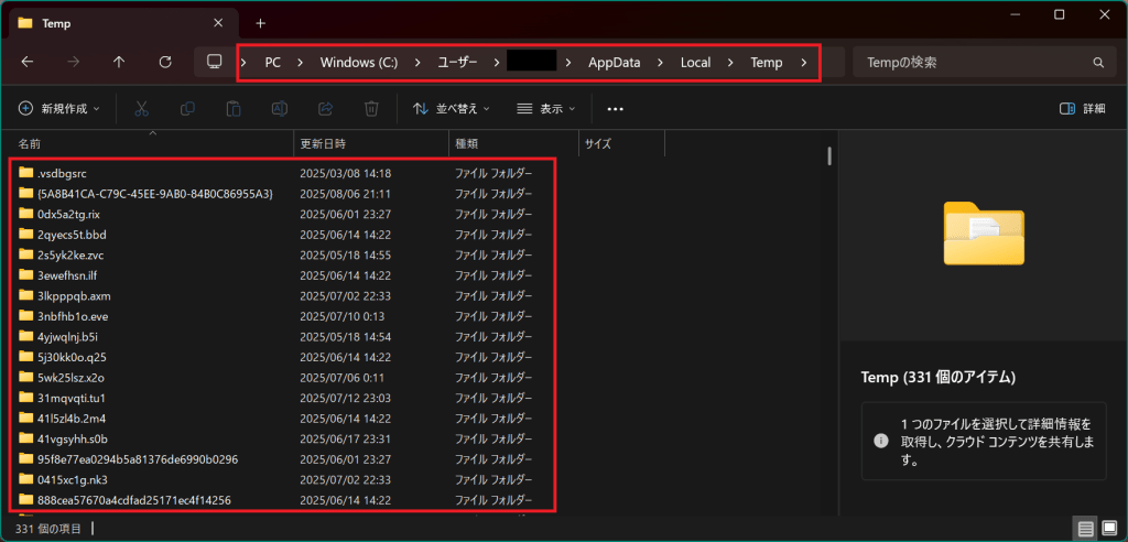 フォルダパスは「C:\users\ユーザー名\AppData\Local\Temp」配下のファイル・フォルダです。(隠しフォルダを表示する設定にしておかなければ「AppData」含め配下は表示されません)