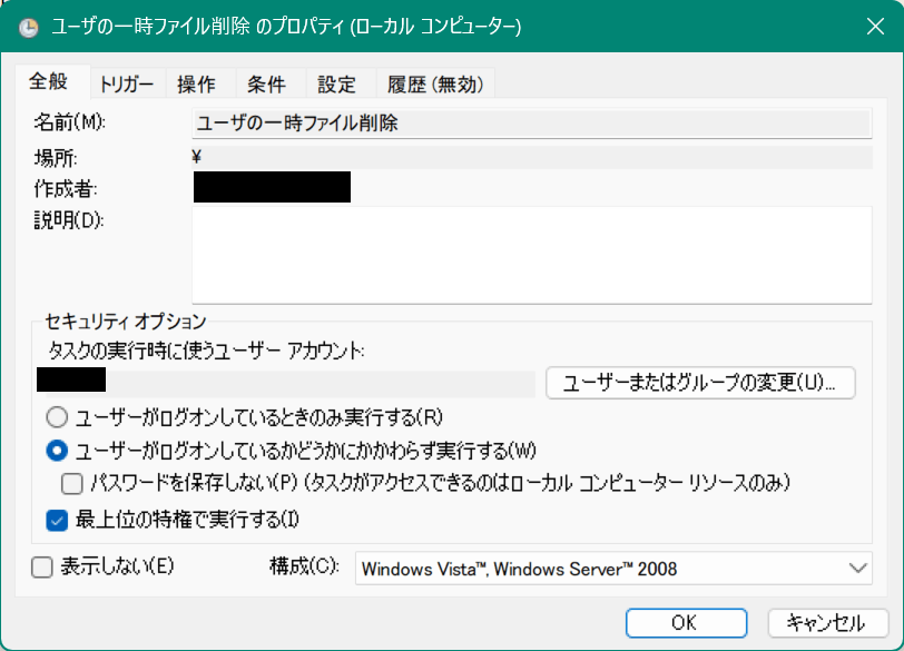 タスク登録後、ユーザーのログオンに関係なく実行させたいので以下のように設定しておきます。