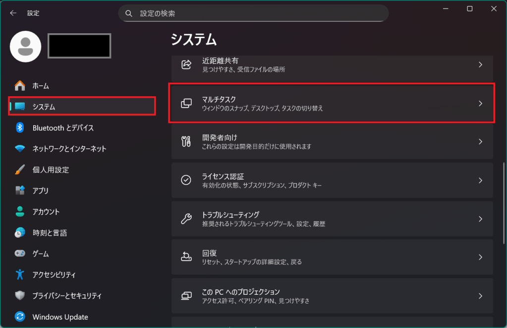 「設定」>「システム」>「マルチタスク」を開きます。