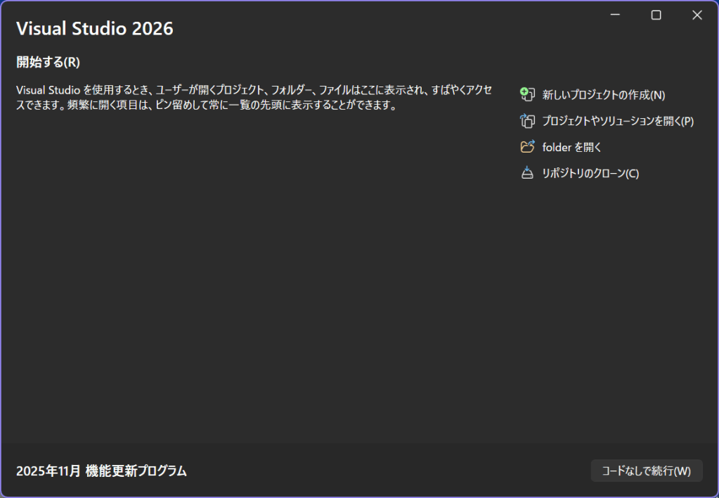 これでVisual Studio 2026がセットアップできました。特に難しい点はありませんでしたね、お疲れ様でした。