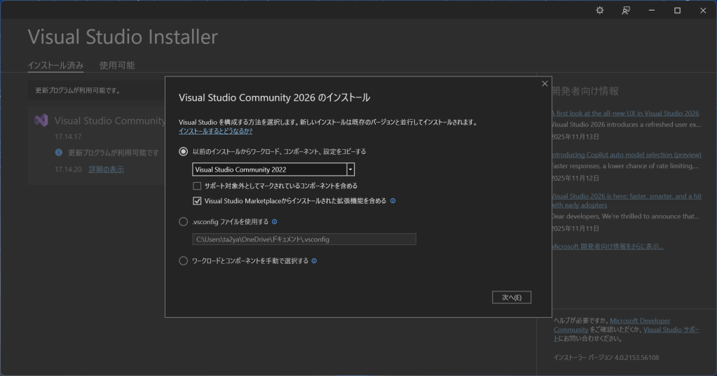 今回はVS2022の設定をコピーして問題なかったので提示の設定のまま「次へ」で進めました。