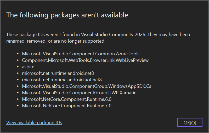 いくつかのパッケージがVS2026では見つからないか、サポートされていないなどの理由で利用できませんでした。OKで進めます。