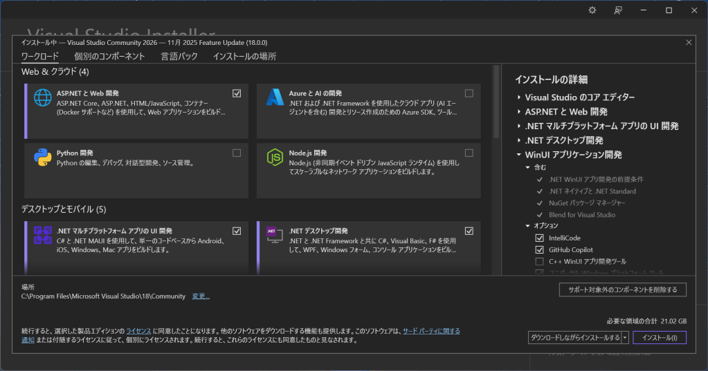 インストールする開発ツールを「ワークロード」と呼び選択を行います。私はASP.NETや.NET MAUI、.NETデスクトップの開発を行うのでそれらを選択して「インストール」で進めました。ここではダウンロードしながら順次インストールする形を選択しました。