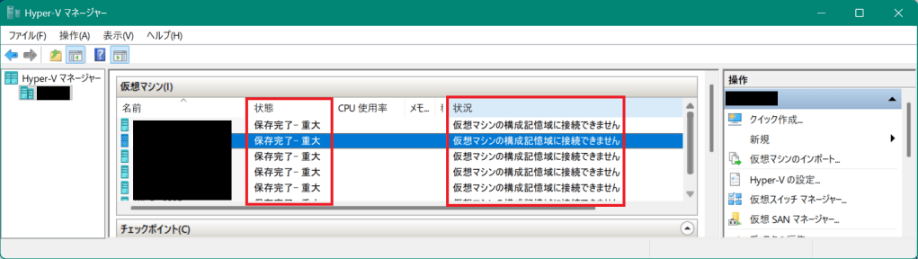 外付けSSD上にHyper-V仮想マシンを配置してりようしていたのですが、あるタイミングから「仮想マシンの構成記憶域に接続できません」というエラーがでるようになりました。その時の対応記録です。