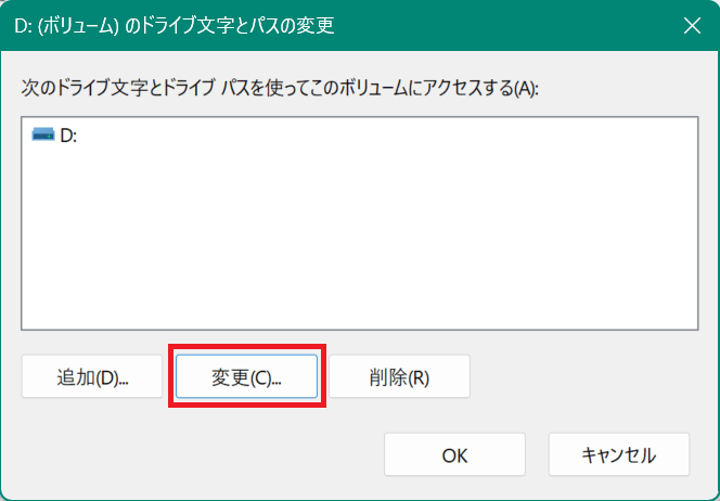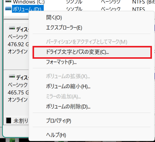 対象のボリュームを右クリックから「ドライブ文字とパスの変更」を選択します。